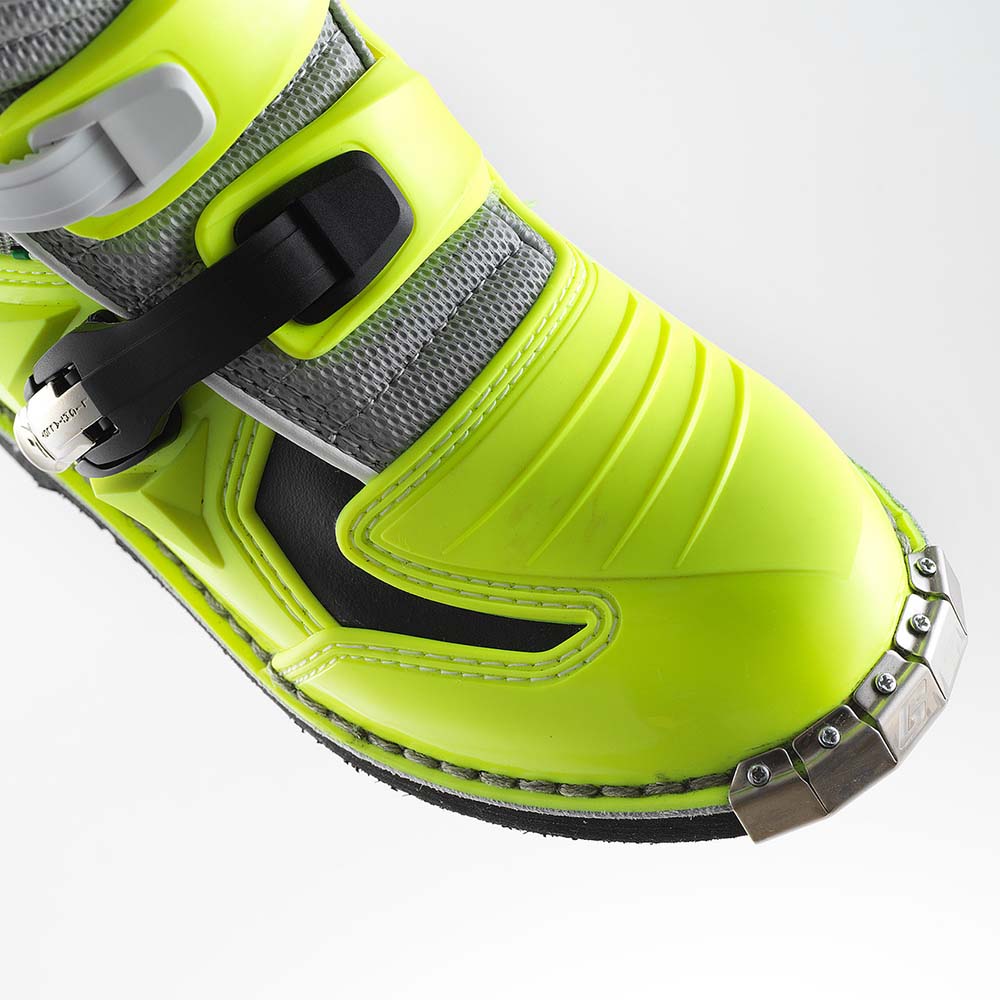 Система застёжек состоит из четырёх лёгких, заменяемых пряжек и верхнего ремешка на липучке. Две верхние пряжки регулируются, позволяя подогнать ботинок под более широкую ногу или ношение с наколенниками — удобно, когда райдер растёт. Со стороны мотоцикла ботинок покрыт тиснёной замшей — она обеспечивает надёжное сцепление с байком и защищает от жара выхлопной системы. Мягкие вставки из пены вокруг щиколоток повышают комфорт, а вентилируемая подкладка из сетчатого текстиля поддерживает циркуляцию воздуха и сохраняет прохладу внутри. Съёмная анатомическая стелька помогает держать ногу сухой и комфортной, чтобы юный райдер мог сосредоточиться только на катании.